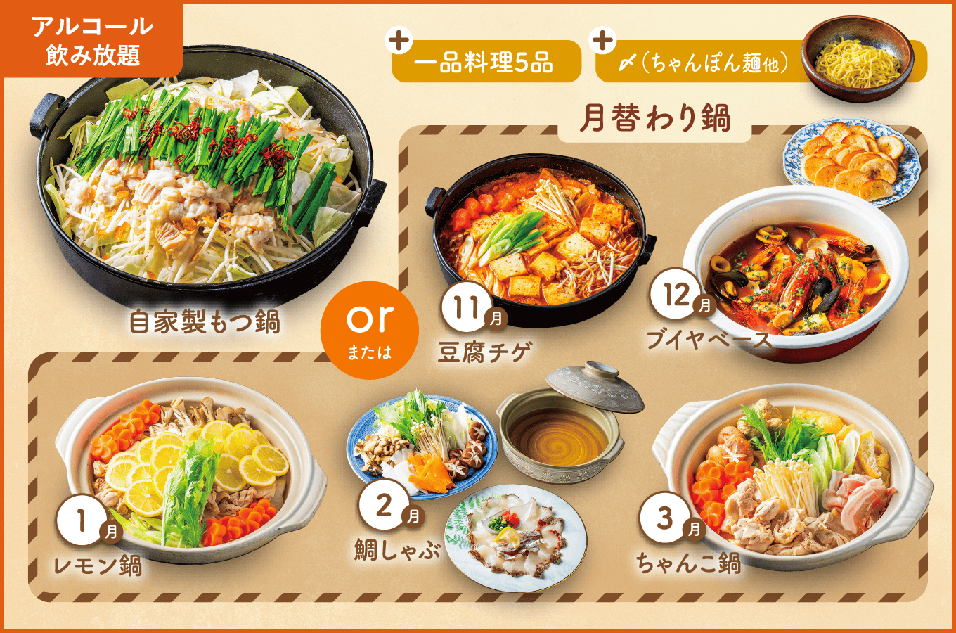 - 〈選べる鍋〉自家製もつ鍋または月替わり鍋(11月:豆腐チゲ / 12月:ブイヤベース / 1月:レモン鍋 / 2月:鯛しゃぶ / 3月:ちゃんこ鍋)