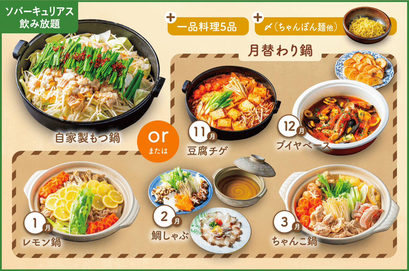 自家製もつ鍋または月替わりで選べる鍋を囲んで心も体も温まる!ノンアル派の方も楽しんでいただけるソバーキュリアスプランもご用意!