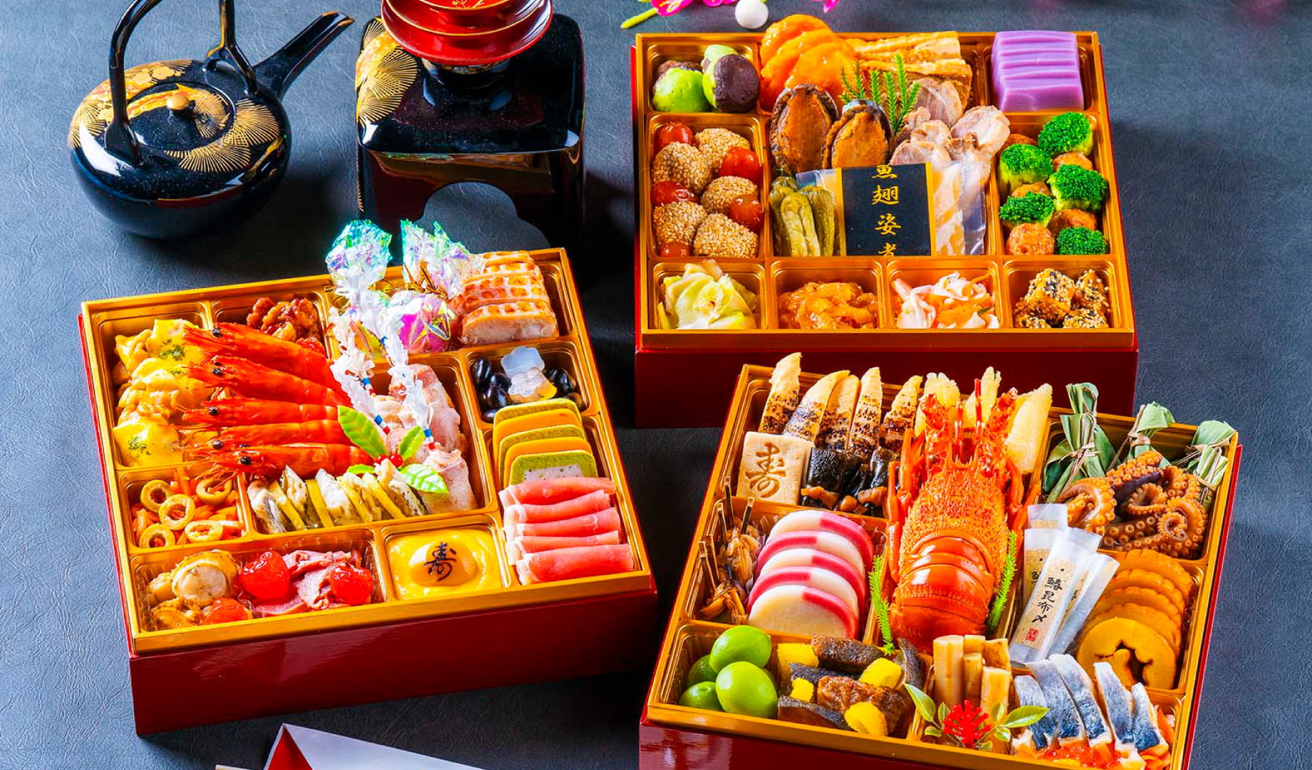 味付焼筍 / 寿高野 / 一口にしん昆布巻 / あさり照り焼き / 紅白彩り蒲鉾 / 新若桃甘露煮 / ブリ照焼 / 網笠柚子 / 松前漬 / 味付数の子 / 田作り煮 / ロブスター / 笹餅巾着 / たこ足割烹煮 / 鰆昆布〆 / 伊達巻 / たたきごぼう / 源平なます / にしん昆布〆レモン / 味付いくら